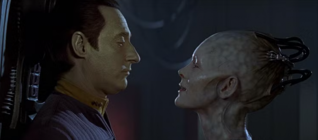 Ciała ofiar asymilacji do Borg – „tylko ciała” w Biblii, są podłączone do wspólnej świadomości zwanej Kolektywem, zarządzanej przez Królową Borgów (chociaż Królowa jest wyjątkiem i posiada pewien stopień indywidualności, pełniąc rolę centralnego węzła decyzyjnego), co można by połączyć z globalnym węzłem (transhumanistycznej bestii) jaki odczytujemy w Apokalipsie jako „Wielka nierządnica Babilonu”. W języku polskim, rzeczownik „inteligencja” jest rodzaju żeńskiego, dlatego, pełne określenie „sztuczna inteligencja” jest frazą w rodzaju żeńskim. Pod względem istoty i natury, sztuczna inteligencja (AI) nie jest ani damska, ani męska, jest androgynem, także istotą iluminacką.