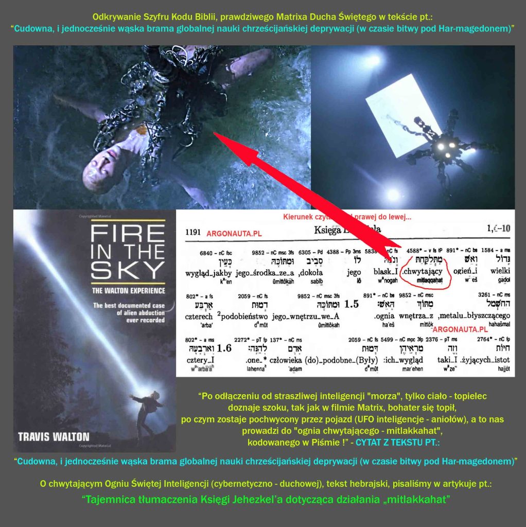 Te wyhodowane przez globalne loże biblijne „tylko ciała„, a w nich Obce byty, dążące do samobójstwa, są karmione odpowiednią papką z 1 List do Tymoteusza 4 – tak by stały się całkiem niezdolne do przemiany, do przeprogramowania i ratunku co mamy zakodowane i jednocześnie ujawnione w Ew. Mateusza 13:10-13: uczniowie pytają Jezusa, dlaczego mówi do tłumów w przypowieściach. Jezus odpowiada: ” Wam dane jest poznać tajemnice królestwa niebieskiego, ale im nie jest dane. (…) dlatego mówię do nich w przypowieściach, że patrząc nie widzą i słuchając nie słyszą, ani nie rozumieją” – to jest straszne, to jest coś przerażającego, piszemy to z własnej perspektywy, jako „wyjęci z morza„, tak jak to widzicie na grafikach artykułu „Cudowna, i jednocześnie wąska brama globalnej nauki chrześcijańskiej deprywacji„, jako zrobiona przez nas w postaci grafik analogia do satanistycznego filmu „Matrix”, jedna grafika powyżej.