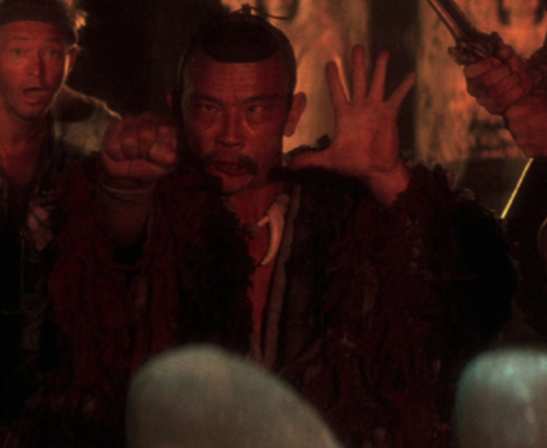 Scena pokazuje, jak Valeria odpycha niewidzialne duchy mieczem, co symbolizuje walkę o duszę Conana. Akiro wydaje okrzyki i gestykuluje, co może wskazywać na trans szamański, w którym komunikuje się z duchami lub odpędza je. W scenie widzimy dym i płomienie, co sugeruje, że Akiro pali zioła lub inne substancje, które wspomagają rytuał. W wielu tradycjach szamańskich palenie ziół (np. szałwii, kadzidła) służy oczyszczaniu przestrzeni i ułatwianiu kontaktu z duchami. Ogień, obecny w postaci pochodni, symbolizuje światło i ochronę przed ciemnością zaświatów.