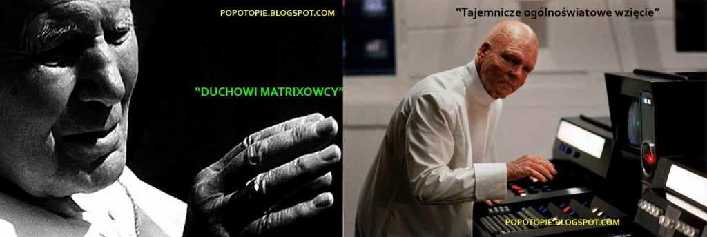 Proszę zobaczyć grafikę kompilację powyżej ze św. Janem Pawłem II, pisaliśmy o tym zjawisku w kilku tekstach, wydaje się nam, że rozpoczęliśmy ją w mocniejszym tonie od artykułu: „„W domu Ojca mego jest mieszkań wiele” – chrześcijaństwo nie z tego świata, tak jak duchy zamieszkujące w nas„, wcześniej też o tym pisaliśmy. Kulminacją była medytacja o tytule: „Czy Chrześcijanie staną się po śmierci fizycznego ciała „kosmitami” ? Zgodnie z teorią „Starożytnych astronautów” ?” Powyżej, we wspomnianej kompilacji, po lewej, widzimy św. Jana Pawła II, po prawej hollywódzki odpowiednik chrześcijańskiej tajemnicy przemiany ludzi w Nowe Istoty, Nowe Inteligencje – anielskie.